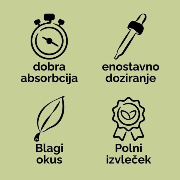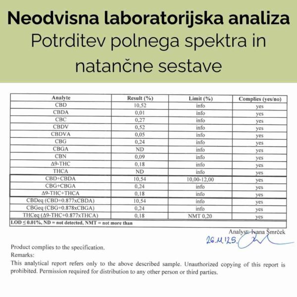 - Polni spekter kanabinoidov (CBD, CBG, CBC, CBDV, CBN, THC (<0,2%)